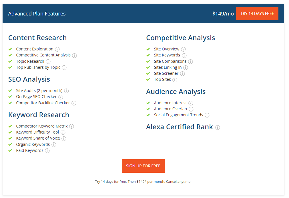 - Feature Specialization: The categorized features cater to users focused on content, SEO, keywords, competitive, and audience analysis.