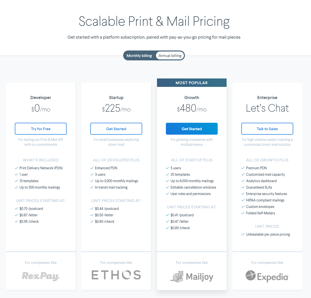 Distinct Tiers: The “Developer,” “Startup,” “Growth,” and “Enterprise” tiers are clearly defined and visually separated, making it easy to compare options.