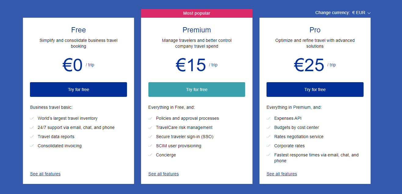 - Basic Needs: The “Free” tier caters to users with basic business travel booking needs.