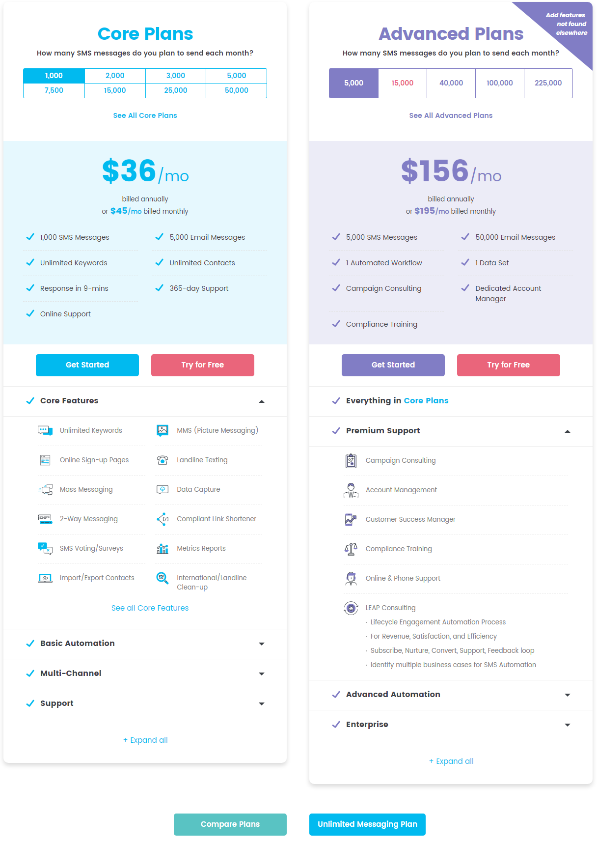 • SMS Message Sliders: The sliders at the top of each tier allow users to select their expected monthly SMS volume, providing a personalized pricing experience.